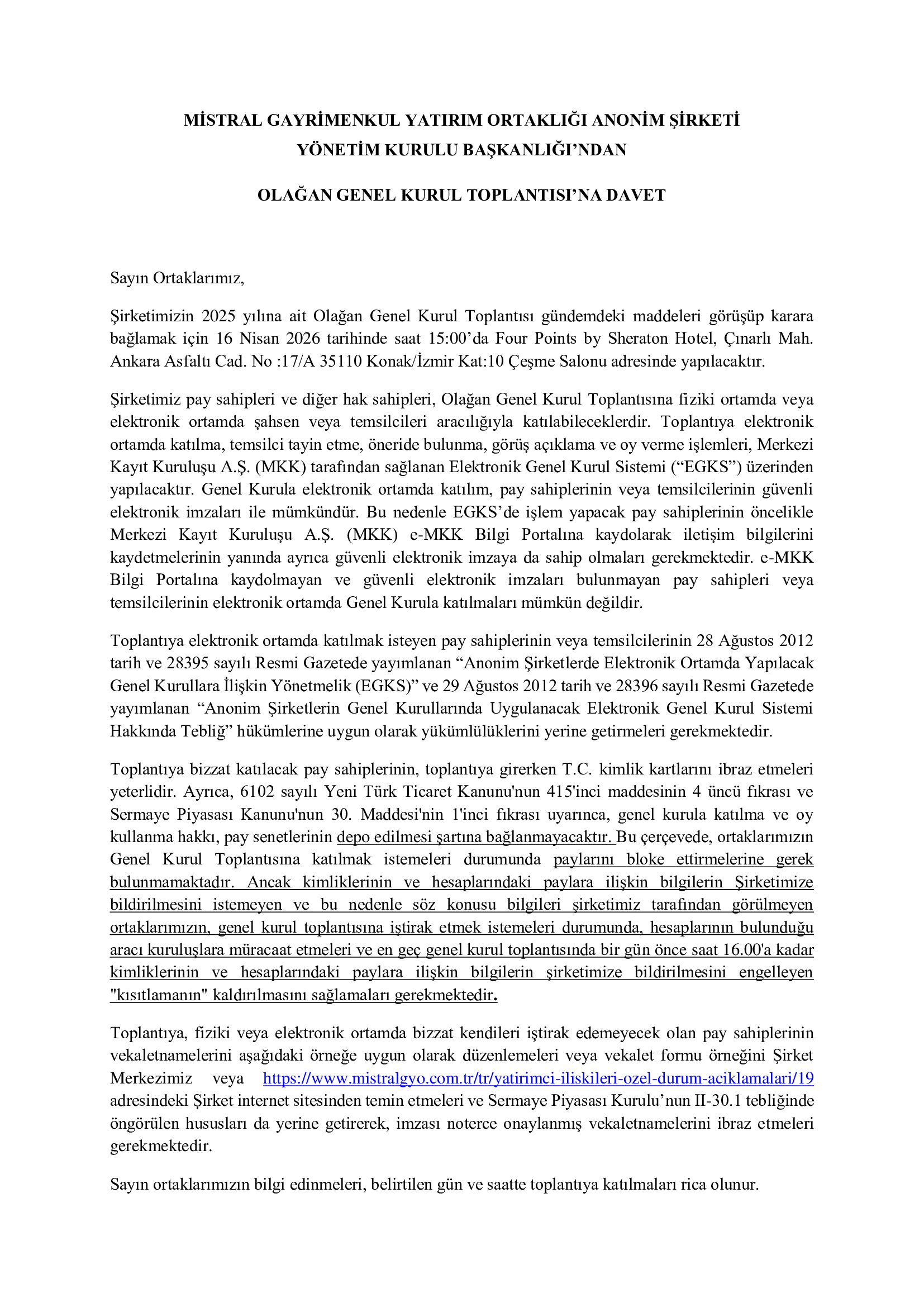 2012 yılında faaliyete geçen ve İzmir’in önde gelen iş adamlarının ortaklığında kurulan Mistral Yapı Gayrimenkul Sanayi ve Ticaret A.Ş., 14 Mart 2016 tarihi itibariyle Sermaye Piyasası Kurulu’ndan gerekli izinleri alıp GYO statüsü kazanmıştır. Şirketimiz, Mistral Gayrimenkul Yatırım Ortaklığı A.Ş. ünvanı ile faaliyetlerine devam etmektedir.
